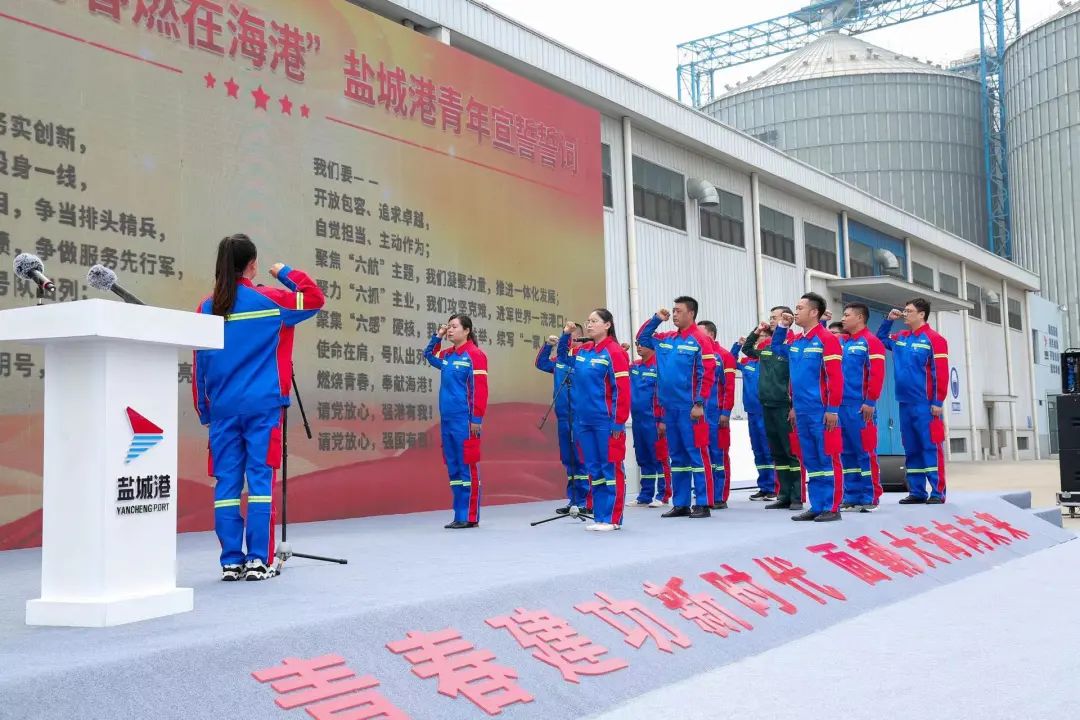 活動中,與會領(lǐng)導(dǎo)為12個圍繞服務(wù)重大項目而組成的青年集體突擊隊進(jìn)行授旗,青年突擊隊、青年文明號代表作表態(tài)發(fā)言,并舉行了“強(qiáng)國復(fù)興有我 青春燃在海港”鹽城港青年宣誓儀式。