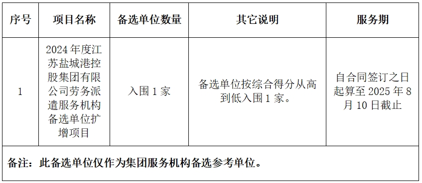 2024年度江蘇鹽城港控股集團有限公司勞務派遣服務機構備選單位擴增項目,招標人為江蘇鹽城港控股集團有限公司,受招標人委托,江蘇鹽城港項目建設管理咨詢有限公司作為招標代理對本項目進行公開招標,資格后審。