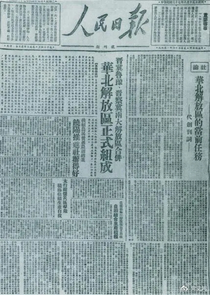 1948年6月15日,晉冀魯豫解放區《人民日報》與《晉察冀日報》合并后出版的《人民日報》創刊號。