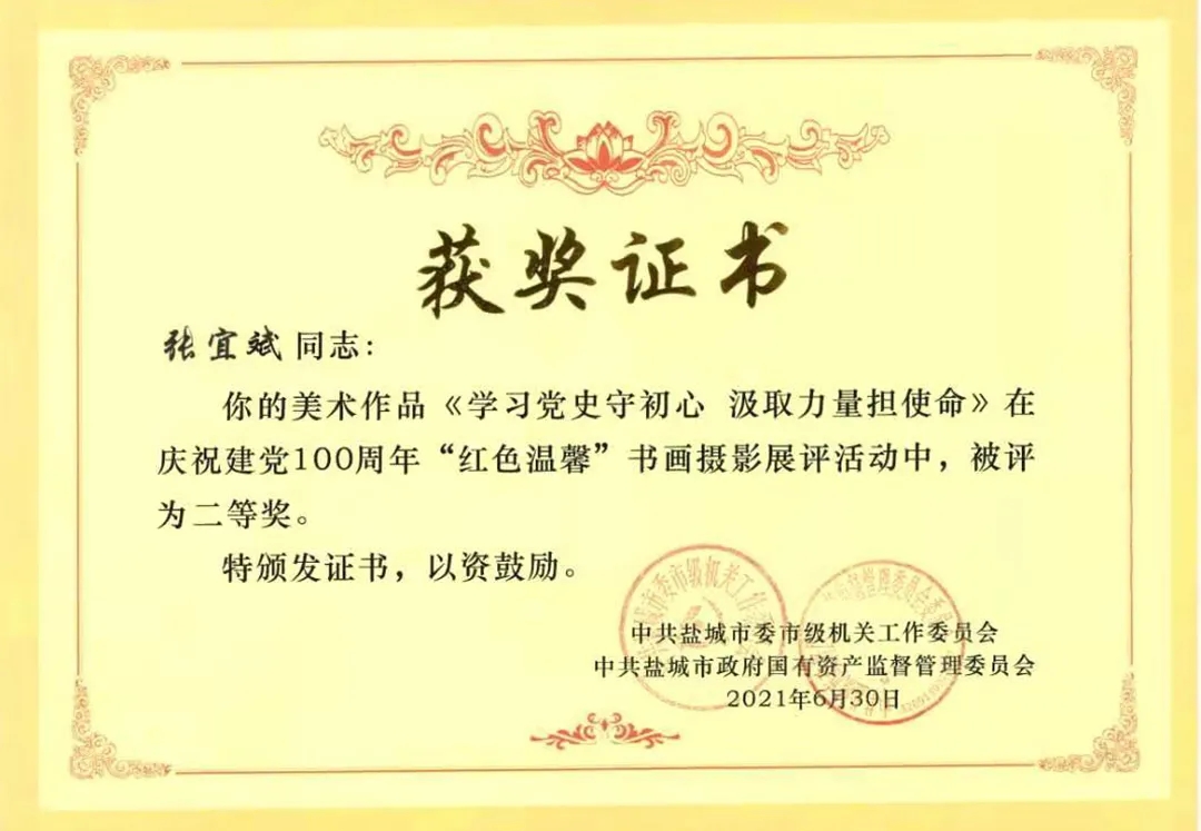 近日,中共鹽城市委市級(jí)機(jī)關(guān)工作委員會(huì)與中共鹽城市政府國(guó)有資產(chǎn)監(jiān)督管理委員會(huì)委員會(huì)發(fā)布《關(guān)于市級(jí)機(jī)關(guān)慶祝建黨一百周年“紅色溫馨”書畫攝影展評(píng)活動(dòng)的表?yè)P(yáng)通報(bào)》,江蘇鹽城港控股集團(tuán)有限公司工會(huì)聯(lián)合會(huì)榮獲“優(yōu)秀組織獎(jiǎng)”,響水港區(qū)張宜斌同志獲得“美術(shù)作品類 二等獎(jiǎng)”。