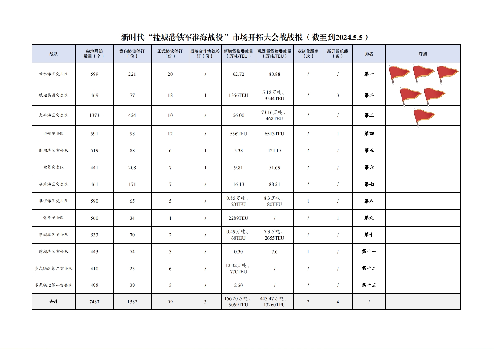 1.累計拜訪客戶數量7487家:其中大豐港區突擊隊1373家,響水港區突擊隊599家,巾幗突擊隊591家,阜寧港區突擊隊590家,青年突擊隊560家,亭湖港區突擊隊533家,射陽港區突擊隊519家,多式聯運第一突擊隊498家,航運集團突擊隊469家,濱海港區突擊隊461家,建湖港區突擊隊443家,黨員突擊隊441家,多式聯運第二突擊隊410家。