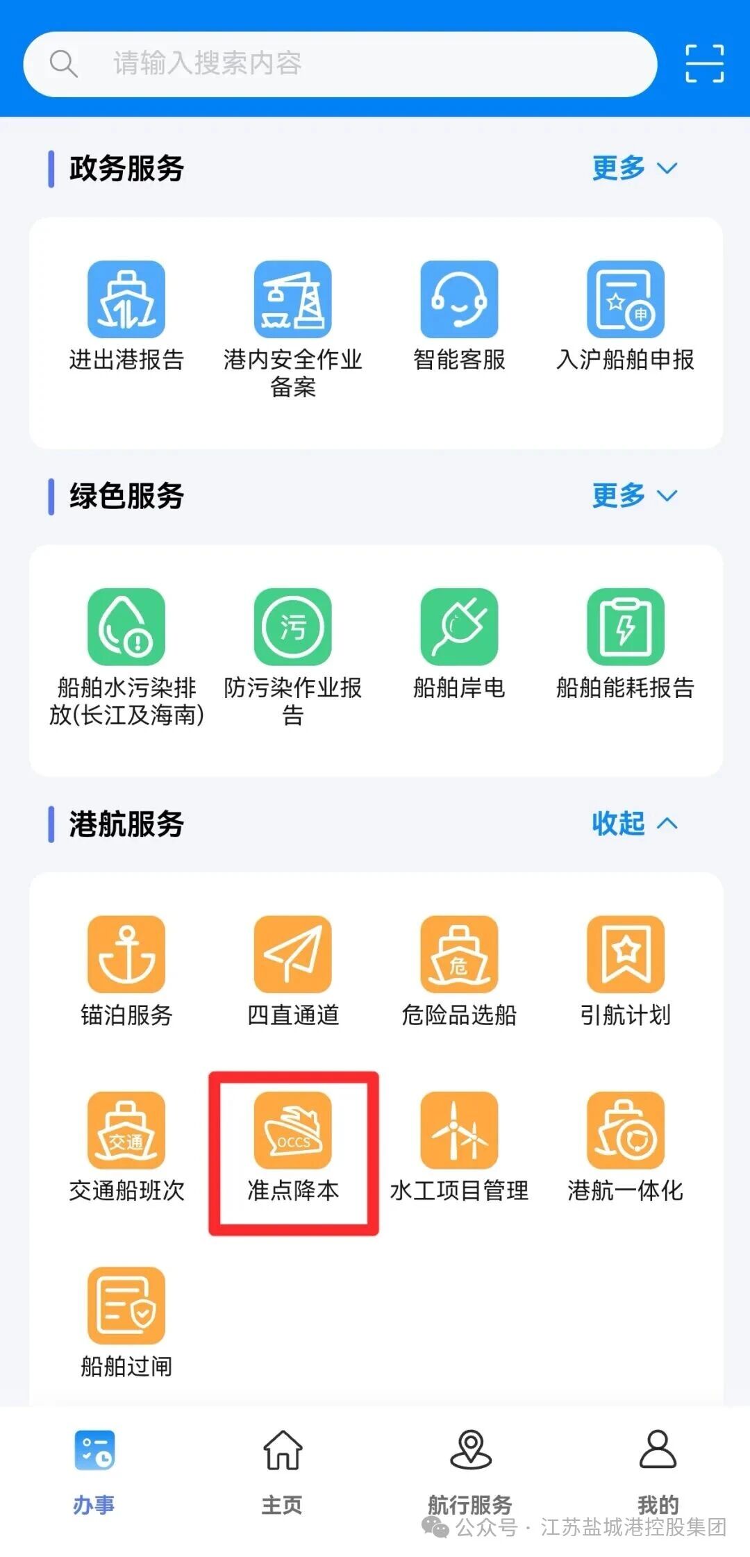 第二步:登陸該法人賬號后,在“辦事”頁面,從“港航服務”欄目中,點擊“準點降本”模塊進入。