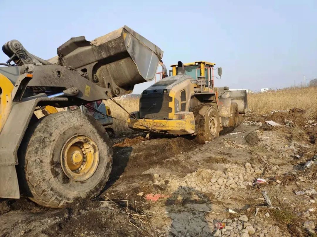 面對連續(xù)的失敗,響水港區(qū)團(tuán)隊(duì)再次展現(xiàn)出了百折不撓,迎難而上的港口工匠精神,深刻剖析前兩次失敗原因,再次調(diào)集一臺(tái)小型挖機(jī)對事件車輛輪子周邊淤泥進(jìn)行清理,回填石子提升其自身摩擦力,同時(shí)針對涉險(xiǎn)裝載機(jī)陷入太深可能造成底盤擱置等情況,調(diào)配一輛裝載機(jī)協(xié)助抬升予以解決,并再次調(diào)集一輛裝載機(jī)采用接力模式增加牽引力。經(jīng)過多臺(tái)機(jī)械的通力配合,受困裝載機(jī)終于在拖拽中緩緩駛出泥潭,圓滿完成救援工作。