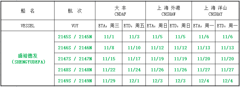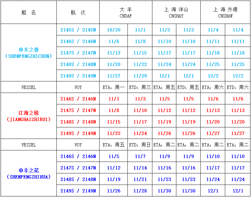 滬鹽專線2021年11月份沿海線船期表