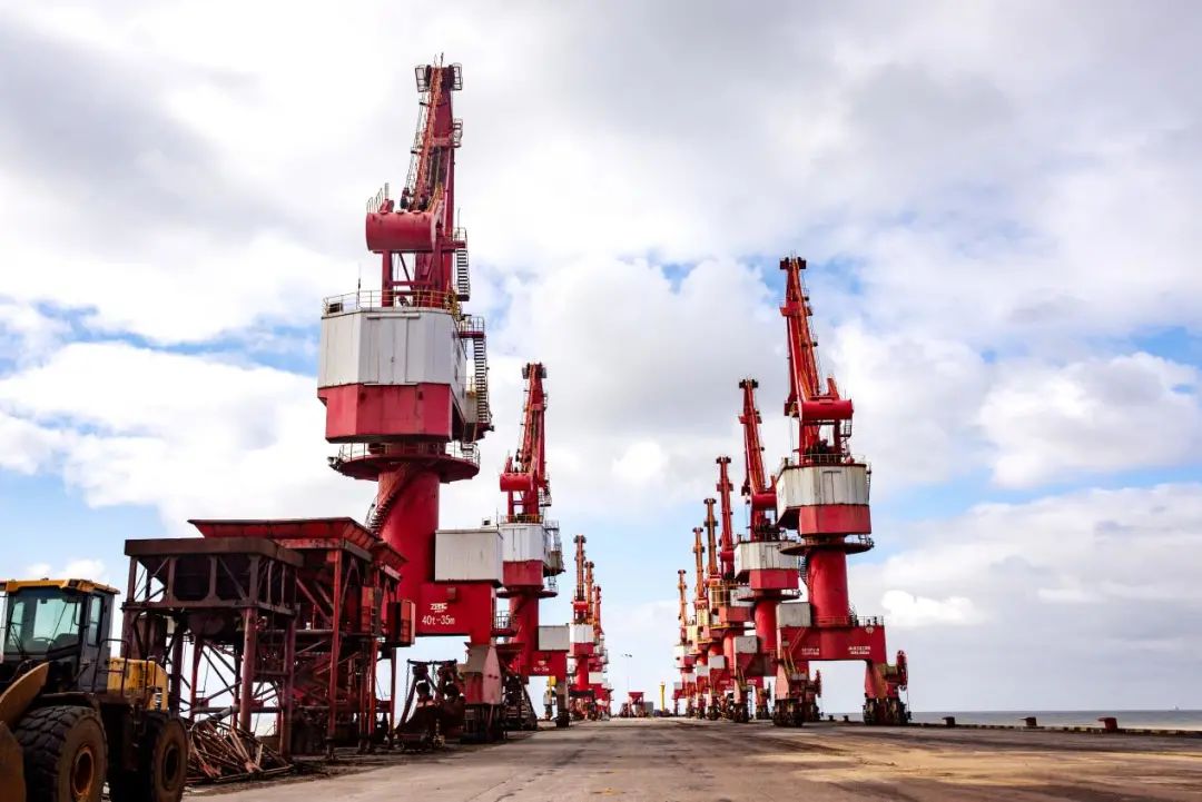 進入碼頭,一條大道直通海邊,來往車輛不斷駛過,一架架重型設備威武的矗立著,像一個個偉岸的戰士。碼頭上汽車的喇叭聲,吊裝貨物的哨子聲,機器的轟鳴聲交織成一片繁忙的景象。