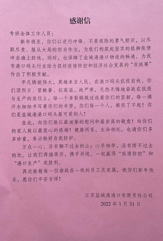 農(nóng)歷大年三十,鹽城港大豐港區(qū)港口公司為外貿(mào)專班集中居住人員送去感謝信,過年期間通過加餐、點(diǎn)亮隔離酒店的燈光等形式,進(jìn)一步造濃節(jié)日氣氛。