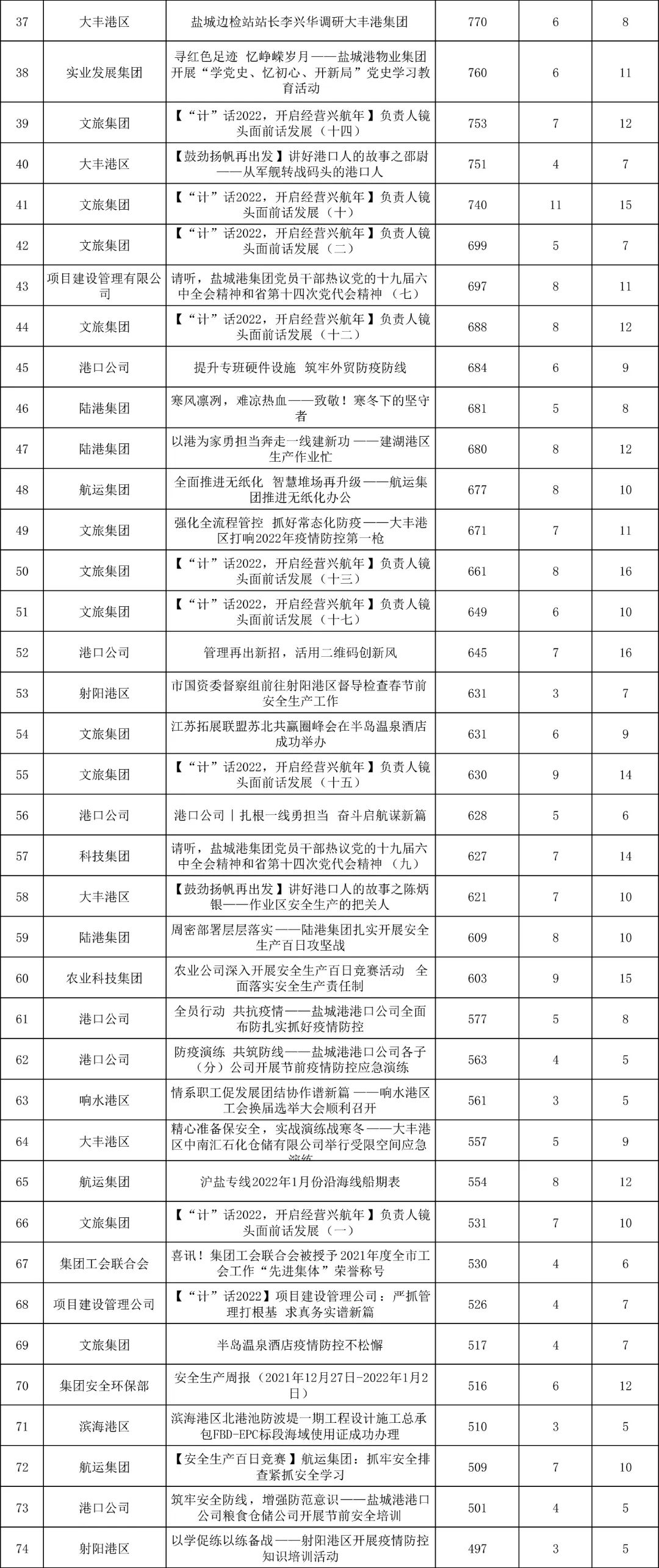 1月,“江蘇鹽城港控股集團(tuán)”微信公眾號(hào)推送文章170篇,截至目前,閱讀總量14萬(wàn)+,各單位供稿111篇。其中,文旅集團(tuán)以2.1萬(wàn)閱讀數(shù),24篇稿件量,遙遙領(lǐng)先;大豐港區(qū)以1.8萬(wàn)閱讀數(shù),16篇稿件量,位列第二;港口公司、響水港區(qū)在供稿方面,以同樣13篇的數(shù)量并列第三,在閱讀量方面,港口公司以1.2萬(wàn)的數(shù)量,位列單項(xiàng)第三;其他港口及板塊集團(tuán)積極參與,踴躍投稿,情況較好。