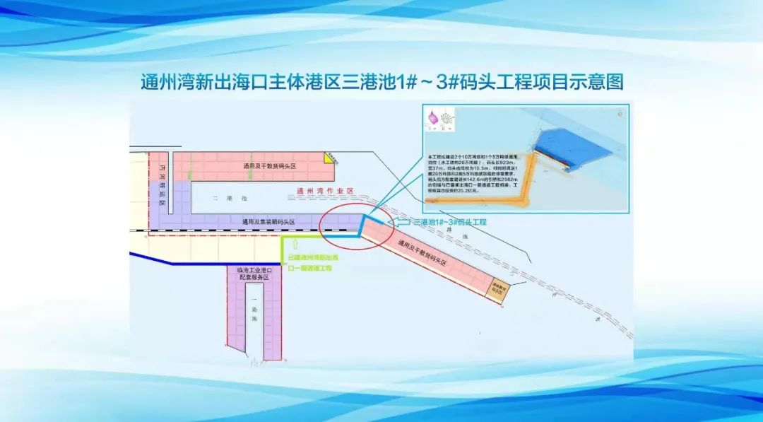 去年底,通州灣新出海口主體港區三港池1#—3#碼頭開工,項目可滿足沿江、沿海產業對大型碼頭中轉的迫切需求。南通港集團建設投資有限公司副總經理尹進軍表示,到2025年,以服務長江經濟帶集裝箱等貨物中轉運輸和臨港工業并重的新出??诔醪浇ǔ桑劭谠O施能力進一步提升、服務功能進一步健全、集疏運體系進一步完善。