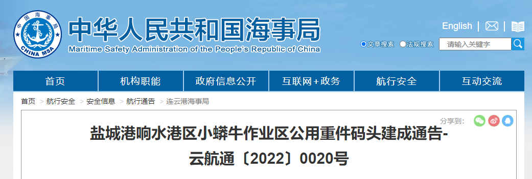 近日,連云港海事局在官網(wǎng)發(fā)布鹽城港響水港區(qū)小蟒牛作業(yè)區(qū)公用重件碼頭建成公告(通航公告)。該碼頭通航運(yùn)營(yíng)后將打開海河聯(lián)運(yùn)出海通道,有效激活港口樞紐功能,更好統(tǒng)籌協(xié)調(diào)地方發(fā)展。