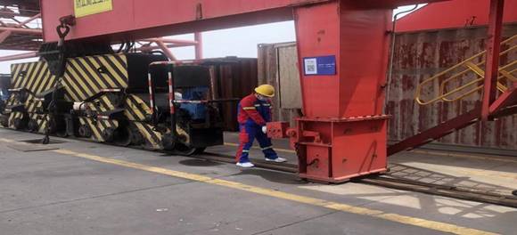 隨著一聲指令的下達,演練正式開始,糧食碼頭1#泊位“騰海明宇”輪作業過程中突然接上級通知,碼頭1小時后將突發強對流天氣,伴有雷電、大風、暴雨等緊急情況。現場調度立即啟動突發極端天氣機械設備防風錨定應急預案,門機停止作業、抓斗降至碼頭面、更換鉤頭、放下行走錨定,保障人員拉起門機防風拉索、安全巡查員對各處防風錨定情況進行再檢查、作業車輛就地停車并開啟雙閃、設備維護組人員全部保持待命搶修狀態。在場人員分工明確、各司其職、井然有序,僅用10分鐘,所有機械錨定任務全部完成,所有作業人員撤離到安全區域進行復盤點評,演練圓滿結束。
