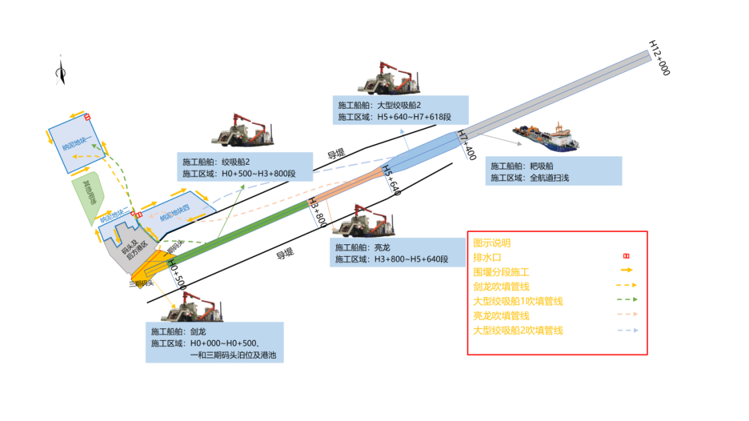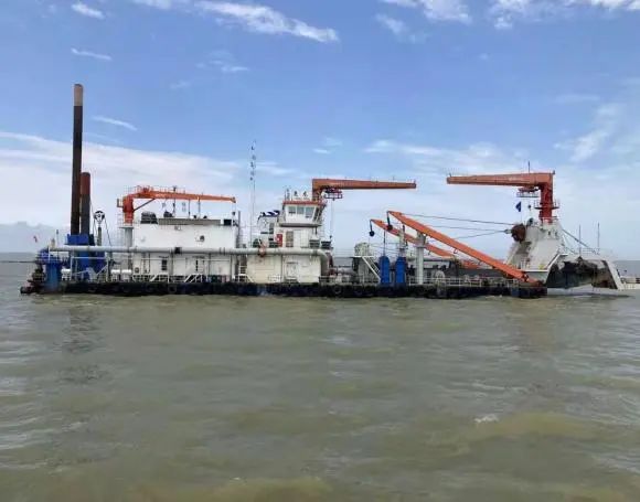 八月飄香季,奮斗正當(dāng)時(shí)。在3.5萬噸航道上,機(jī)器轟鳴,“普交工1”號(hào)、“劍龍”號(hào)、“亮龍”號(hào)三“艦”合璧,將疏浚航道產(chǎn)生的疏浚土通過管線輸送到指定的納泥區(qū)。圍堰上,工人們鉚足干勁,土工布鋪設(shè)、袋裝土碼砌加緊施工……現(xiàn)場(chǎng)一片熱火朝天的建設(shè)景象。