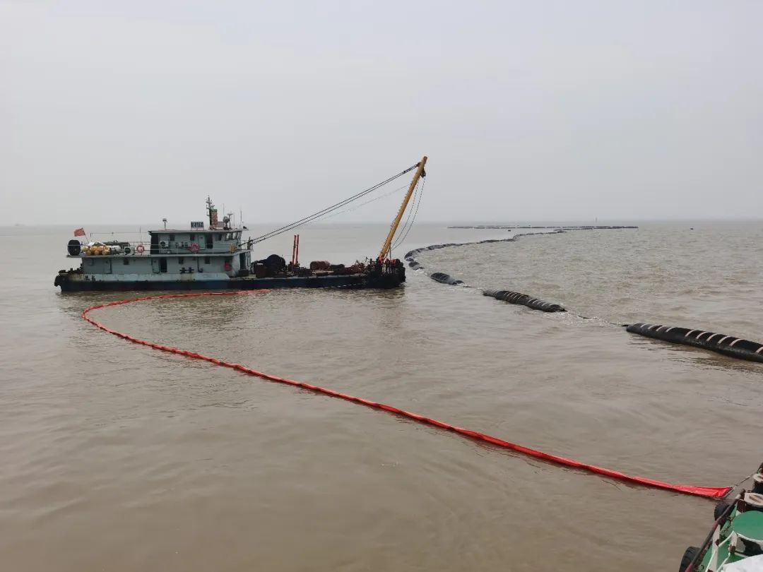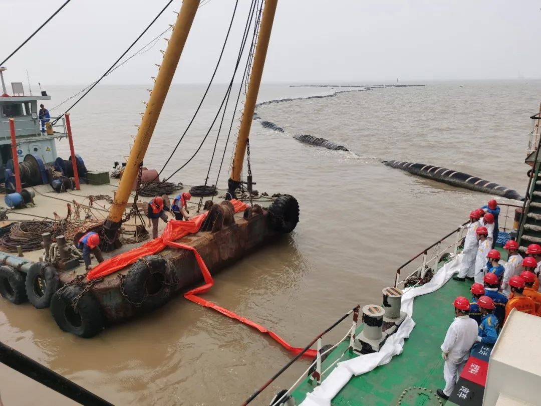 隨后,溢油演習正式開始,“左舷船中錨機壓管漏油啦!”“新海鯉”輪船長接報后立即拉響了防油污警報,同時船長通過全船廣播告知溢油地點,根據(jù)應變部署要求,立即切斷漏油源頭,控制油污流入海面,清理甲板現(xiàn)場污油。同時上報施工項目部,項目部組織“航工301”、“茸洋168”、“海盛189”輪立即趕赴灌河口航道轉(zhuǎn)運點參與新海鯉輪的水面油污清理工作,通過各輪齊心協(xié)作,成功完成清污工作。