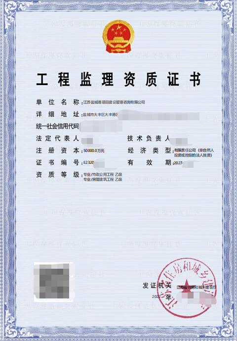 2022年11月18日,項(xiàng)目管理公司獲得由江蘇省住房和城鄉(xiāng)建設(shè)廳頒發(fā)的“房屋建筑工程乙級和市政公用工程乙級”兩項(xiàng)工程監(jiān)理資質(zhì)證書,標(biāo)志著公司資質(zhì)申辦工作取得重大進(jìn)展,對提升公司品牌影響力,提高市場競爭力具有重要的意義。