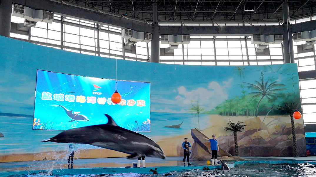 在海洋世界里,可愛的海豚在馴養員的指揮下盡情地舞動著,從水中一躍而上而又輕輕落入水中,展現著靈活的身姿。海豚的精彩表演和與觀眾的親密互動,贏得游客陣陣喝彩和掌聲。