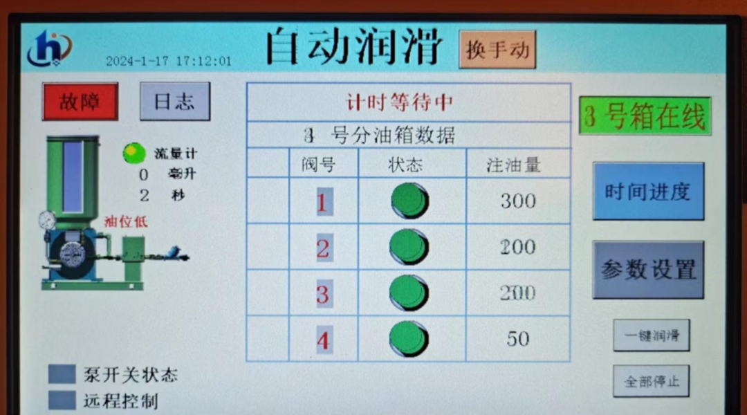 而本次改造后的集中潤滑系統是信息技術、自動化控制技術、現代潤滑技術充分優化集成的高新技術產品,預計每年可以降低港區人力成本及設備維修成本不少于15萬元。具體可體現出九大優點:能夠精準設置、控制每個智能分油箱出口的出油量;能夠精確設置、控制不同機構的注油周期;能夠設置、控制每個潤滑點的需油量;能夠監控智能分油箱每個出油口的堵塞故障和報警;能夠監控系統主管路的泄漏故障及報警;能夠監控油桶儲油量的缺失及報警;能夠通過控制箱進行查看實際潤滑情況及故障;能夠根據機構運行時間設置大周期,且故障信號、注油信息與主機PLC互聯互通并可在手機端進行實施監控設備潤滑狀況的操作。