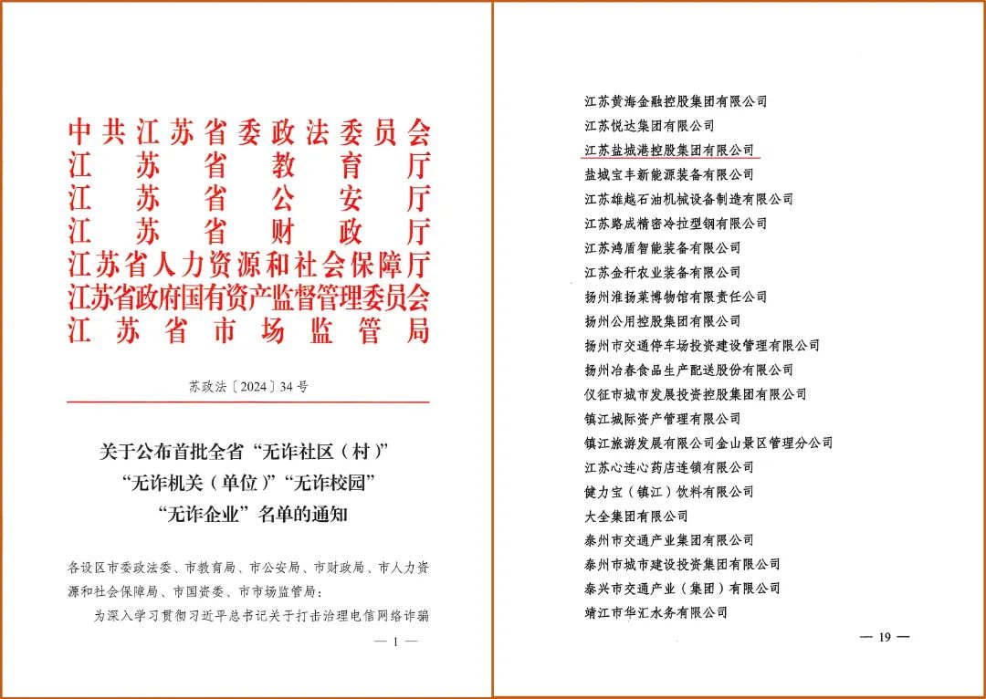 近日,首批全省“無詐社區(qū)(村)”“無詐機(jī)關(guān)(單位)”“無詐校園”“無詐企業(yè)”名單公布,鹽城港集團(tuán)被授予省級(jí)“無詐企業(yè)”稱號(hào)。