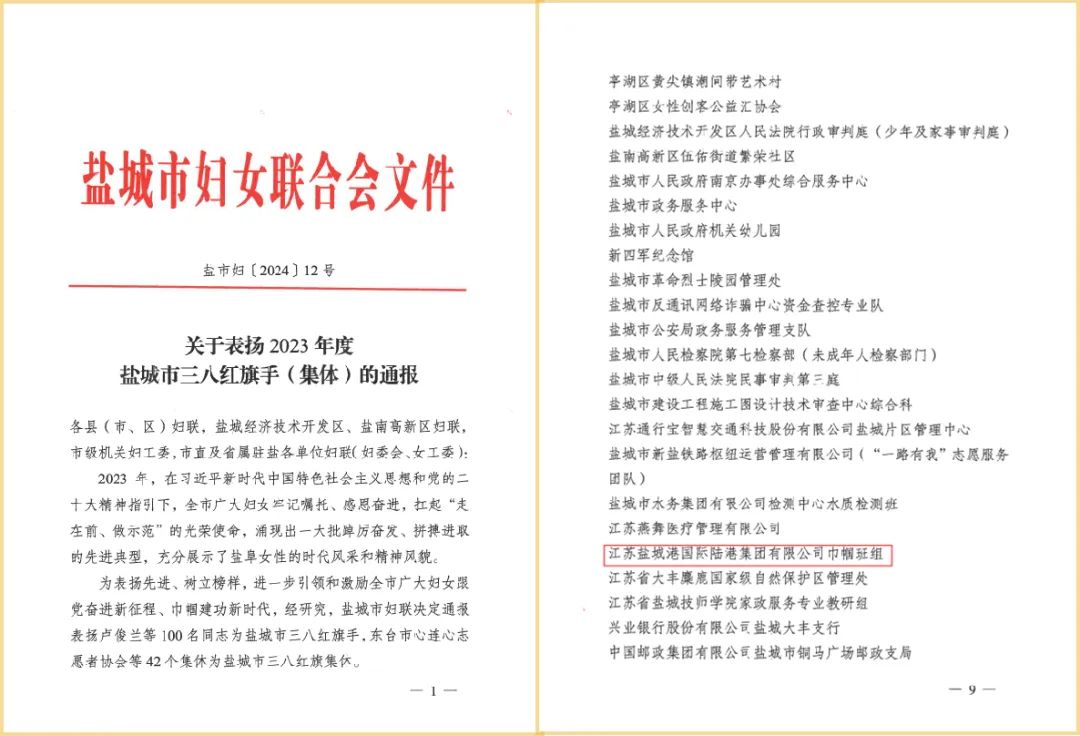 近日,鹽城市婦女聯(lián)合會發(fā)布《關(guān)于表揚(yáng)2023年度鹽城市三八紅旗手(集體)的通報》,江蘇鹽城港國際陸港集團(tuán)有限公司巾幗班組被評為“2023年度鹽城市三八紅旗集體”。