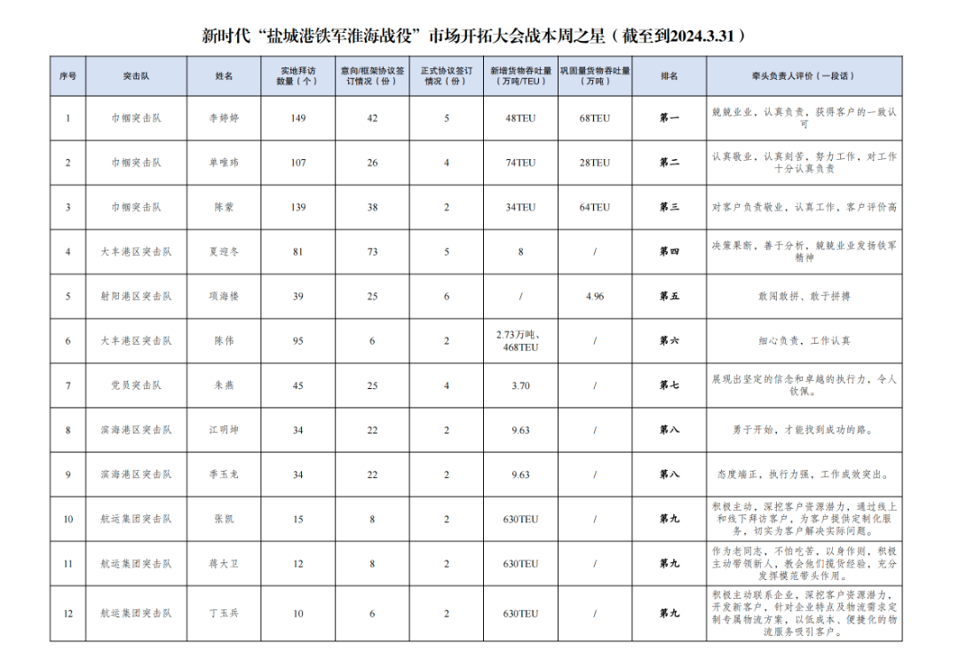 第一名:航運集團、響水港區(qū)突擊隊、阜寧港區(qū)突擊隊、巾幗突擊隊、多式聯(lián)運第一突擊隊突擊隊1次
