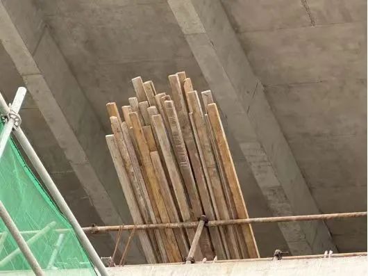 混凝土結(jié)構(gòu)施工區(qū)域,淺棕色木方違規(guī)傾斜堆放于臨邊圍擋處,遇外力(如碰撞、大風)易發(fā)生墜落,威脅下方作業(yè)人員安全。
