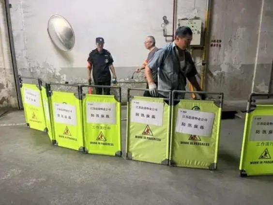 隨著防汛警報(bào)響起,物業(yè)應(yīng)急小組迅速集結(jié),攜帶防汛沙袋、防洪插板、抽水泵等物資設(shè)備趕赴西大門。各小組按照預(yù)案分工展開作業(yè):搶險(xiǎn)救援組兵分兩路,第一分隊(duì)使用專業(yè)工具快速搬運(yùn)并組裝鋁合金防洪插板,在車庫(kù)入口處構(gòu)筑起臨時(shí)擋水墻;第二分隊(duì)緊隨其后,用沙袋在插板后方疊筑“品”字形防洪墻,每層沙袋間用防水布加固,確保無(wú)滲漏縫隙。設(shè)備保障組同步啟動(dòng)移動(dòng)式抽水泵,對(duì)積水區(qū)域?qū)嵤?qiáng)排作業(yè),同時(shí)安排技術(shù)人員對(duì)故障排水系統(tǒng)進(jìn)行緊急搶修。全程通過(guò)智能廣播系統(tǒng)循環(huán)播放疏散提示,引導(dǎo)周邊居民有序撤離至臨時(shí)安置點(diǎn)。