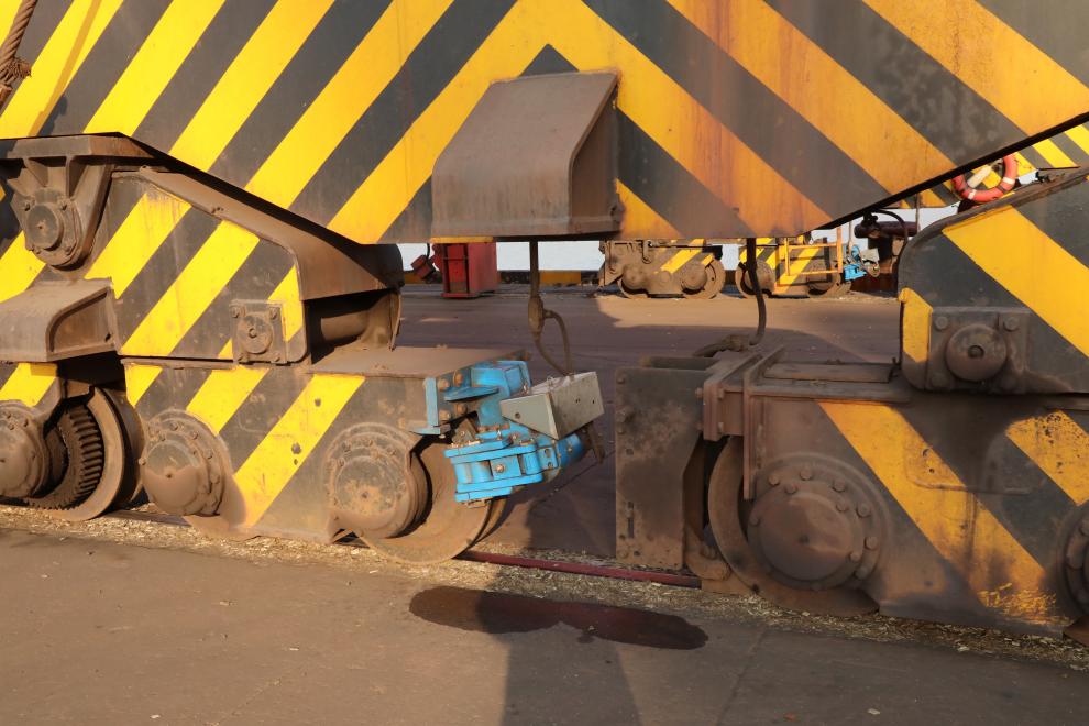 該裝置工作原理類似于汽車的“剎車盤”。當(dāng)強(qiáng)風(fēng)吹動(dòng)門機(jī)滑移20至30公分時(shí),系統(tǒng)內(nèi)置的自動(dòng)編碼器會即時(shí)感應(yīng)并觸發(fā)夾輪器,將行走輪牢牢鎖死在軌道上,形成剛性制動(dòng)。這套系統(tǒng)響應(yīng)迅速、制動(dòng)可靠,從根本上提升了大型機(jī)械在惡劣天氣下的抗風(fēng)能力與作業(yè)穩(wěn)定性。