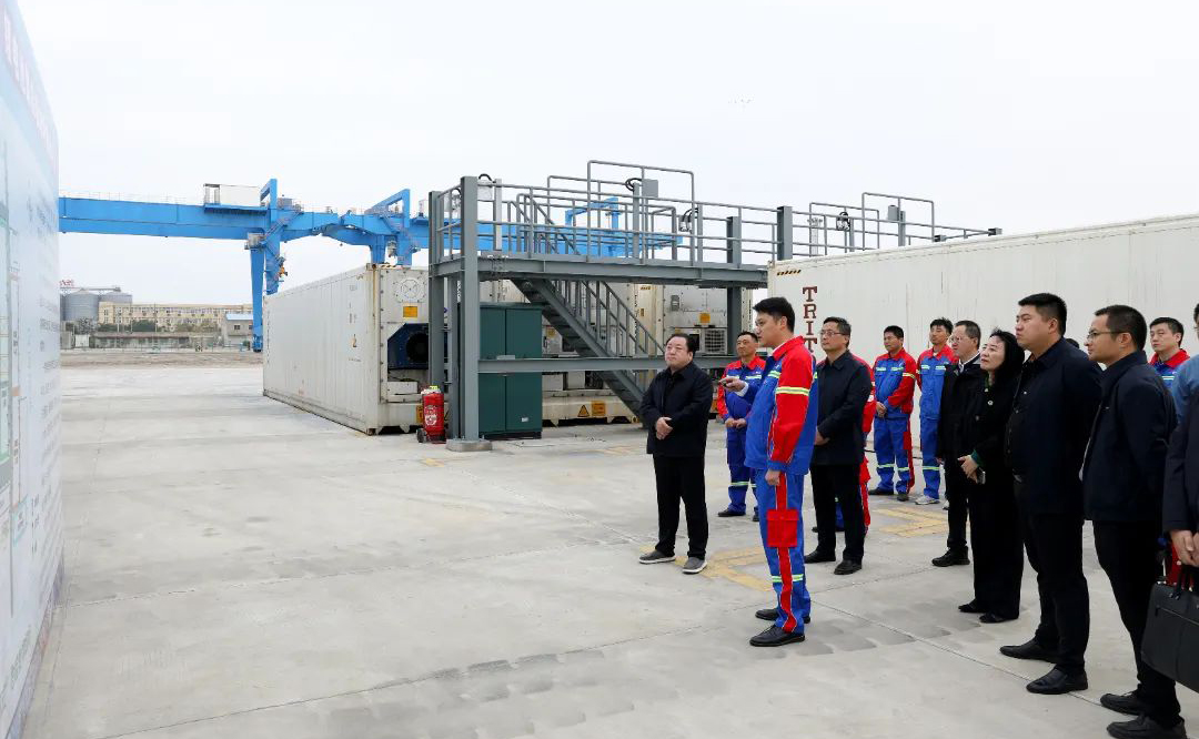 調(diào)研后,周正雄在自動(dòng)化集裝箱堆場(chǎng)召開(kāi)座談會(huì)議。