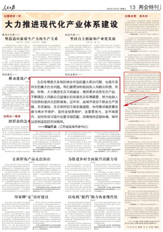 “鹽城是長(zhǎng)三角中心區(qū)城市中唯一一個(gè)農(nóng)業(yè)總產(chǎn)值超千億元的城市,穩(wěn)住農(nóng)業(yè)基本盤是我們的重大政治責(zé)任。”全國(guó)人大代表、江蘇省鹽城市委書記周斌表示,鹽城將踐行大農(nóng)業(yè)觀、大食物觀,努力建設(shè)“東部沿海大糧倉(cāng)”“生態(tài)食品大超市”“鄉(xiāng)村休閑大花園”,擦亮現(xiàn)代農(nóng)業(yè)名片。