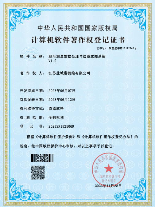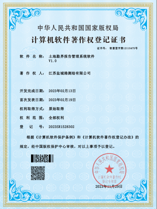 鹽城港港航勘測設計公司一直高度重視技術發(fā)展創(chuàng)新和知識產(chǎn)權保護,現(xiàn)已獲得測繪OA綜合管理系統(tǒng)軟件、地形測量數(shù)據(jù)處理與繪圖成圖系統(tǒng)、航空攝影測量數(shù)據(jù)采集軟件、三維建模數(shù)據(jù)處理和信息管理軟件、土地勘界報告管理系統(tǒng)軟件五項軟件著作權。